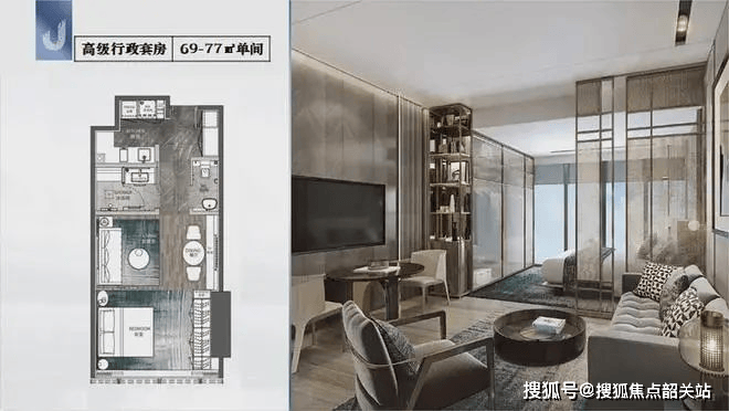 高级行政套房:69-77㎡单间,适合追求高效生活的单身贵族或情侣。