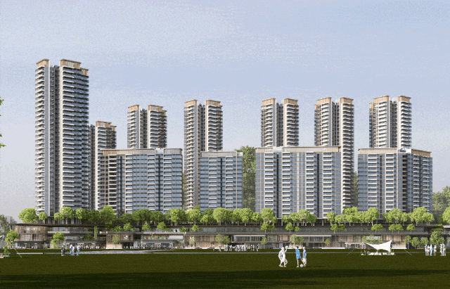 :项目整体容积率 2.17,密度低。一期由 7 栋 32 层塔楼与 4 栋 16 层小高层板楼组成,非超高层。抬高约 20 米,打造立体花园、商业、空中会所等豪宅级高阶配套。