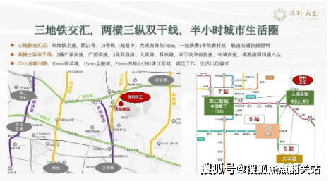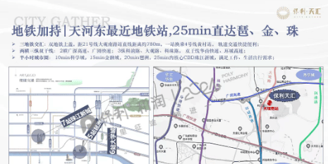 保利天汇地理位置优越,位于天河智慧城核心区内,周边汇聚了网易总部、酷狗、南方测绘等多家知名企业,形成了强大的产业集聚效应。项目距离21号线大观南路站约1.2公里,步行大约需要15分钟,建议业主可以购买小电车进行地铁接驳。自驾出行方面,广深高速、广园快线等多条主干道环绕四周,方便快捷地通达城市各区域。整体来说,通过地铁或自驾均能快速到达珠江新城、琶洲等地,交通便利性极高。