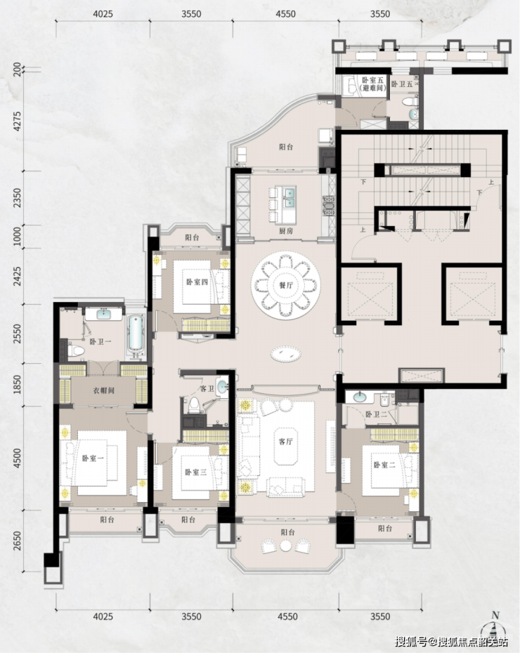 例如,约236平方米的A3星盈淡雅户型,采用五房三厅五卫的设计,空间布局合理且功能齐全。南北通透的设计使得室内空气流通顺畅,同时奢享江城园景。而约263平方米的A2星熠暖阳户型,极目江景奢阔空间,户型望江面幅面超16米,不仅客厅,三个房间都能欣赏到一线江景,让业主时刻与自然美景相伴。