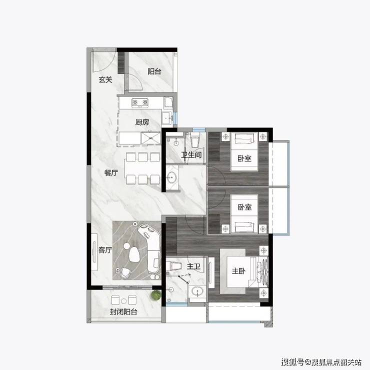 121㎡ 3+1房2厅2卫,L型入户尊崇体验,约8.1m长南北通透都荟宽厅,约5m长270°观景阳台,约46㎡豪宅式社交空间。