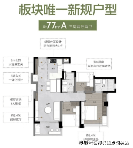 77㎡户型:三房两厅两卫,三面宽南向,LDKB一体化客厅。
