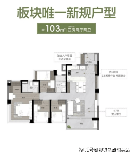 103㎡户型:四房两厅两卫,独立入户花园,带约7米通铺阳台。