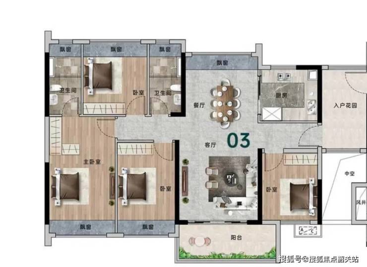 当然,如果你预算有限,还有117平的四房可供选择。该户型同样能做到四开间朝南,6.9米的阔景阳台令景观视野开阔之余,整体空间感也比同面积段的产品强出一截。其中一间次卧与阳台连通,不仅能扩大卧室的面积,还能增强采光,提高居住舒适度。