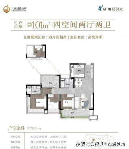 101㎡四房两厅两卫:双卧套房设计,主卧带独立卫浴,适合二胎及三代同堂家庭,空间宽敞舒适。