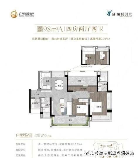 98㎡四房两厅两卫(A/B两版):A户型赠送面积较大,使用率约102%,动静分区清晰,适合刚改家庭;B户型布局稳健,私密性更佳。