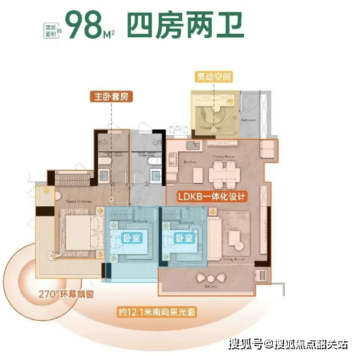 约98㎡四房两卫:空间更为宽敞,满足多代同堂的需求。