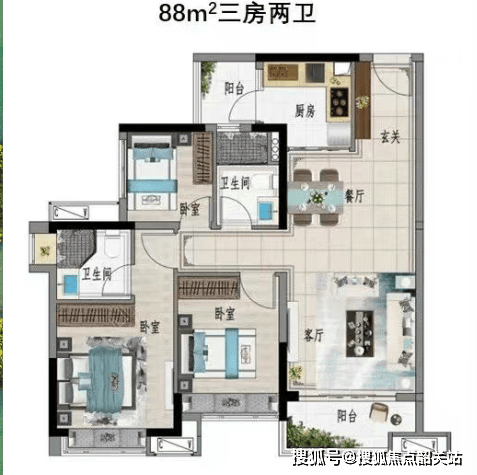 建面约88㎡“2+1”户型:双阳台的惬意