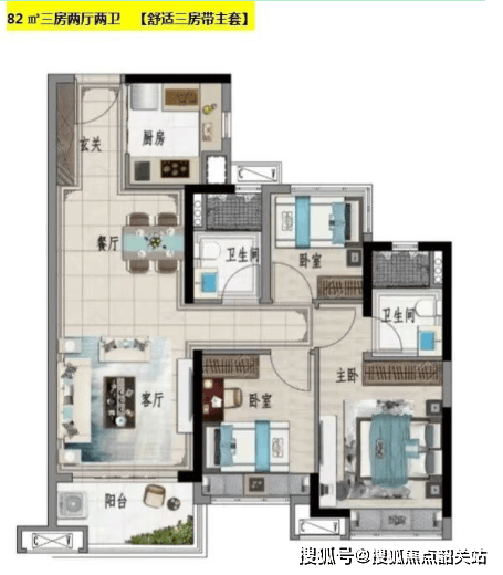 建面约84㎡带主套宜居“2+1”户型:从容自得的生活