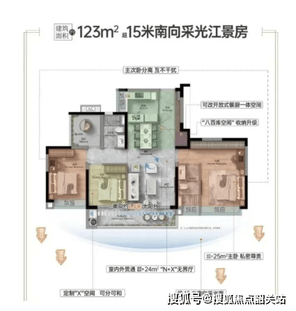 建面约125㎡四房:被誉为“王牌户型”,实现4.5开间朝南,15米超长采光面,主次卧双南向,LDKG(客厅、餐厅、厨房、阳台)一体化设计,空间感与互动性兼备;