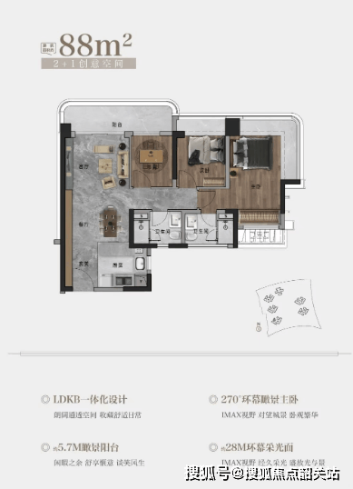 主力户型集中在88㎡到143㎡之间,全部采用3.05米层高。即便是最小的88㎡三房,也配了5.7米长阳台和L形270°飘窗;105㎡以上户型实现四开间朝南,南向房间占比超九成。所有户型均为LDKB一体化设计(客厅、餐厅、厨房、阳台打通),空间感更强。值得一提的是,二期实用率超过100%,意味着公摊极小,实际使用面积比建筑面积还大——这在新规实施后的新盘中属于领先水平。