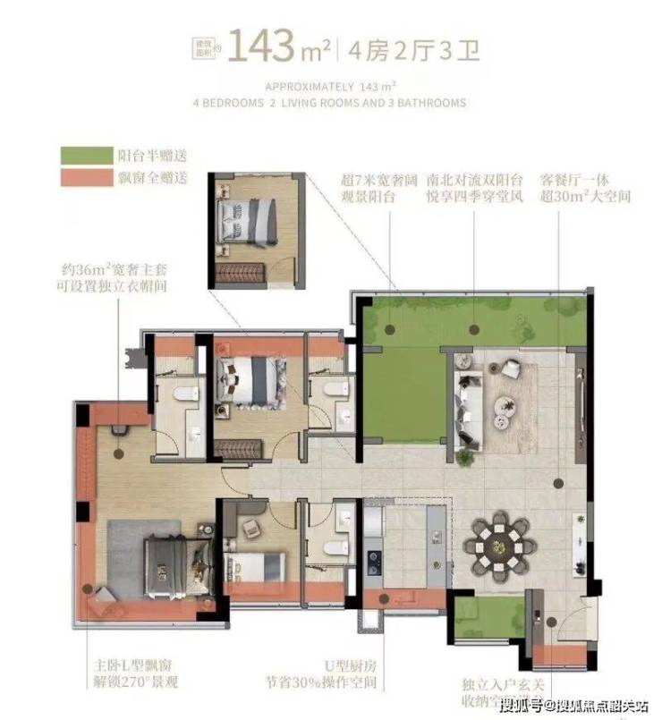 时代创客小镇推出的全新125-143㎡户型一经亮相便吸引了众多改善客户的目光。其中,125㎡四房户型堪称“空间魔术师”,通过超高使用率与人性化设计,实现了空间的最大化利用。而143㎡四房户型则更显阔绰,南北对流双阳台设计保证了通风采光效果,每个房间都带有落地飘窗,使阳光可以充分洒入房间。