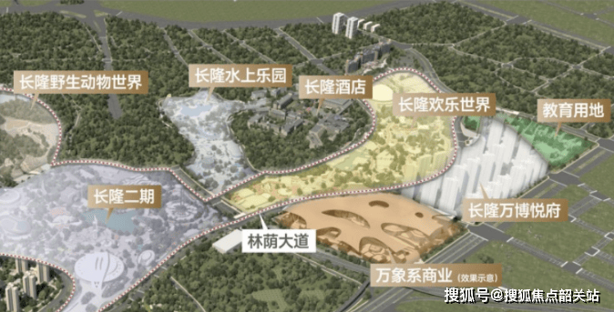 项目坐落于番禺长隆 - 万博 CBD的核心地带,是广州城市南中轴的关键节点。该区域经过多年发展,已成为番禺的经济、商业与文旅核心。官方数据显示,万博商务区已汇聚企业超 27000 家,涵盖多家知名互联网与科技总部,商务氛围浓厚。同时,项目无缝衔接国家 5A 级景区长隆旅游度假区,每年吸引超 4000 万客流,带来旺盛的人气与活力。随着万博板块官方扩容,占地面积由 1.5 平方公里拓展至 7.2 平方公里,项目所在的核心地块成功打通了此前分隔万博与长隆的屏障,实现两大价值板块的深度融合。由此,项目占据了独一无二的 “左手长隆、右手万博” 的C 位地段,成为区域价值飞升的直接受益者,其核心地位在番禺乃至广州都极具稀缺性。