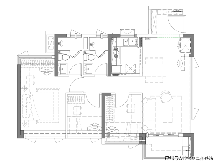 以76平方米的主力户型为例,该产品在有限的面积内实现了三房两卫且四面宽朝南的空间布局。客厅、卧室等主要生活空间均朝向南面,最大化地获取日照资源,而独立入户花园的设置则解决了小户型常见的收纳痛点。客厅通过全面屏采光飘窗与阳台相连,形成约270度的全景视野,配合开放式厨房与餐厅、客厅的一体化设计,打破了传统小空间的局促感,让家庭社交在无界的流动空间中自然发生。