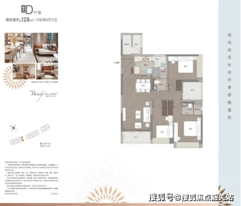 建面约 128㎡的五房两厅两卫户型采用了横厅设计,6.8 米的宽景阳台,视野开阔,空间感强。