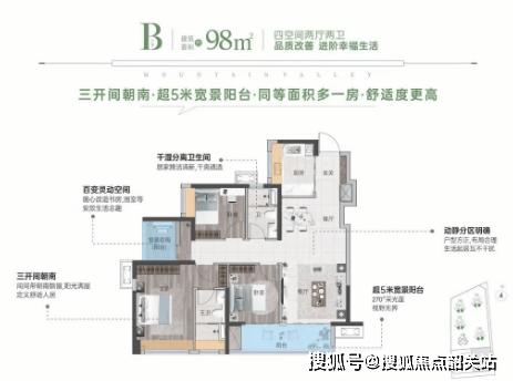 目前在售户型包括85平方米三房两厅两卫、98平方米四房两厅两卫及103平方米四房两厅两卫。这些户型设计注重实用性与舒适性的结合,例如85平方米户型拥有约5米宽大阳台,视野开阔;98平方米户型则以超5米宽阳台和超高赠送率成为精英阶层的理想之选。