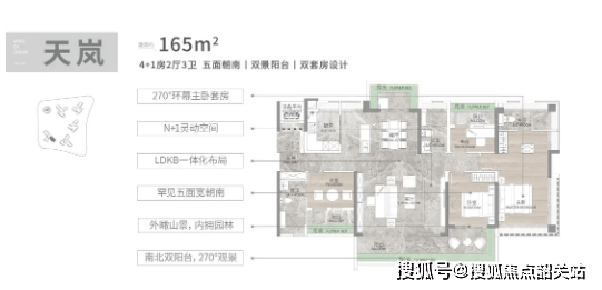 建面165平4+1房大平层:双阳台南北对流,四开间朝南,中式厨房+独立西式岛台,三面望山景,朝南面宽达17.4米,近9米L型景观阳台,双主套设计,主卧270度折叠屏飘窗,高端大气,适合高端改善家庭,尽享奢适居住体验。