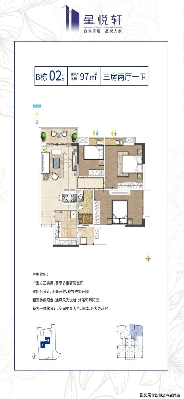 105㎡三房:南北通透,6.5米观景阳台直连客厅与次卧,视野无遮挡。