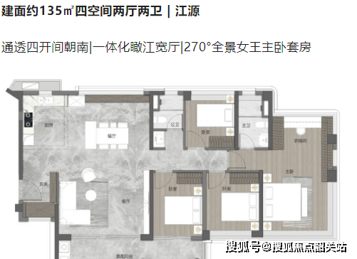 135㎡四房两卫:270° 全景主卧套房 + 一体化瞰江宽厅,三开间朝南,二孩家庭首选;