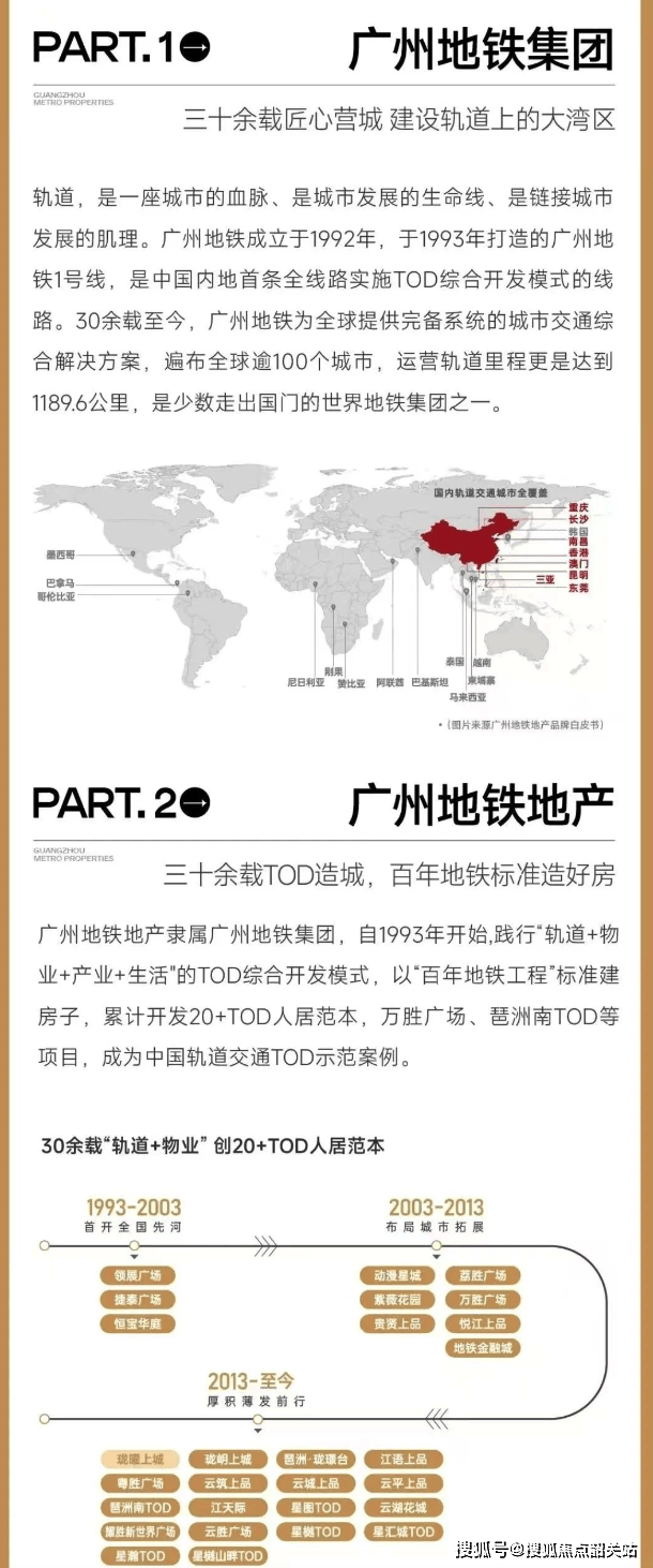 广州地铁地产隶属广州地铁集团,自 1993 年起践行 “轨道 + 物业 + 产业 + 生活” 的 TOD 综合开发模式,以 “百年地铁工程” 标准建房,累计开发 20 多个 TOD 人居范本,如万胜广场、琶洲南 TOD 等项目 。