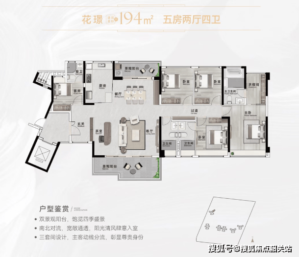 194㎡ 五房2厅4卫(三套房):双景观阳台设计,南北对流,观景与生活两不误,非常适合大家庭居住。