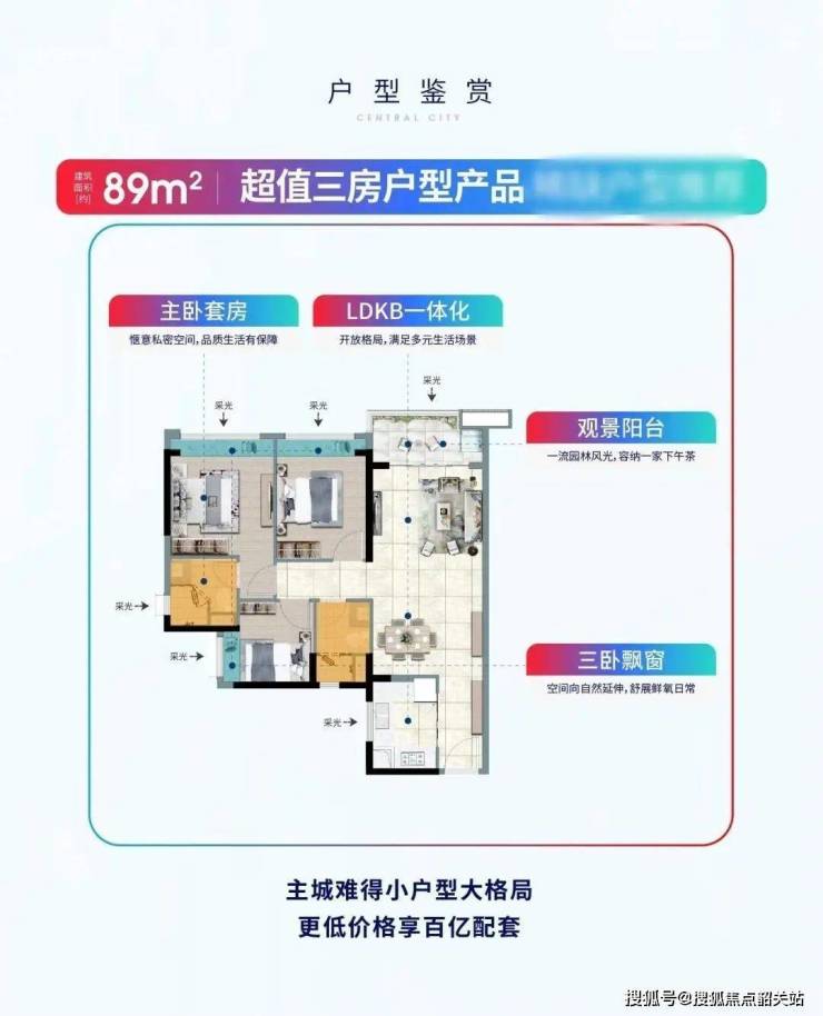 85㎡三房:南向三开间,主卧带飘窗,总价380万起(竞品同面积总价420万+);
