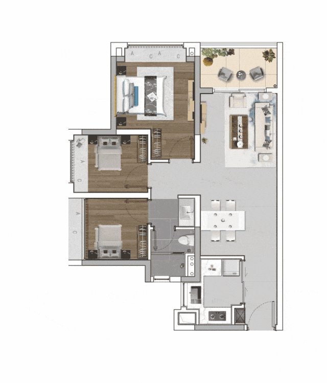 面积最大的建面约96-98㎡4房2厅2卫,算是建面约87㎡的进阶版,近7米的超宽景观阳台以及主卧奢阔的独享衣帽间,更彰显主人尊贵品味。