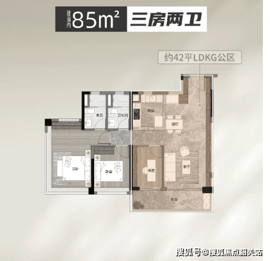 建面约85㎡三房两卫,带6米大阳台,户型方正,南北通透,使用率高,空间布局合理,兼顾实用性与舒适度,适合三口之家居住,既能满足日常居住需求,又能预留一定的活动空间,性价比突出。