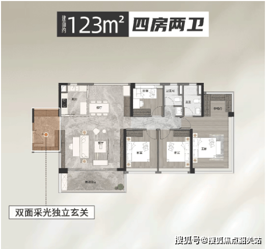 建面约123㎡四房,户型宽敞舒适,每个卧室都可放下1.8米大床,体验感相当于144㎡大宅,品质感更高,适合改善进阶人群,空间充足,可满足家庭的多元化居住需求,兼顾舒适度与私密性。