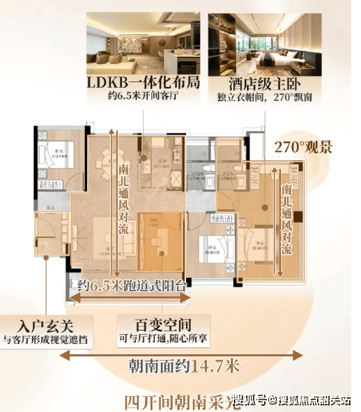 建面约106㎡舒适改善四空间,空间使用率远超同级别面积产品,能满足全周期家庭所需。户型为全明设计,约14.7米南向面宽,餐客厅与主卧均实现南北通透,清风时时流连。独立入户玄关设计,优化入户动线,避免开门即见户内,营造归家尊崇感。