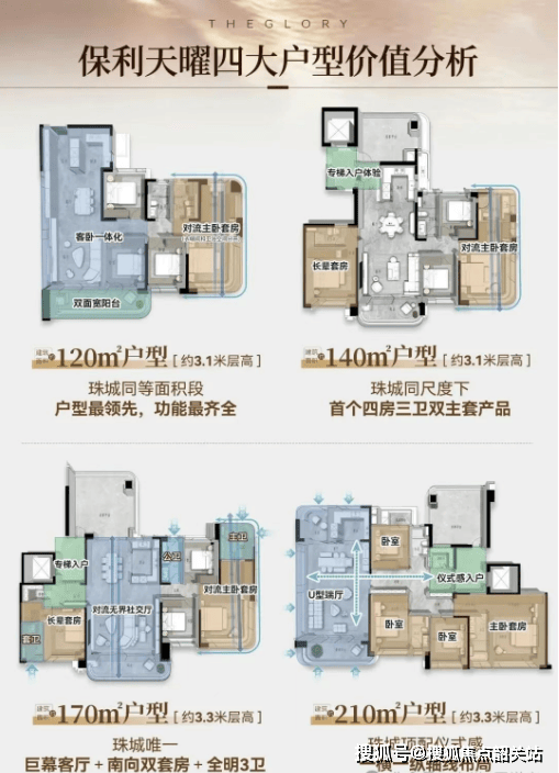 保利天曜主打改善型户型,包括90平方米三房两厅两卫和120-210平方米四房户型。特别值得一提的是,阳台占比可达25%,不计容的公共开放空间面积也能达到10%,使得实际使用率有机会提升至130%。项目采用正南北全T2板楼设计,保证了通风、采光及侧向江景和珠城景观的最大化。