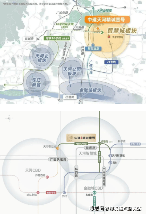 中建精诚壹号坐落于天河智慧城板块,具体位置在火炉山森林公园脚下,东侧紧邻约3万㎡的原生态碧湖东大湖。尽管离最近的地铁21号线天河智慧城站有1.8公里的距离,但项目周边自驾条件优越,毗邻科韵路、华观路,附近设有华南快速和沈海高速出入口,交通便利。此外,规划中的10/30号线交汇站华观站距离项目仅600米,未来将进一步提升区域交通便捷性。