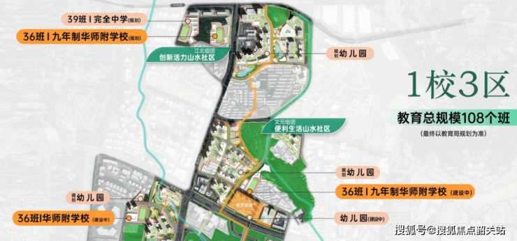 学校规划:整个项目规划有8所学校(4所幼儿园+1所小学+2所九年制+1所完全中学),华师附已签约,提供目送式全龄教育。
