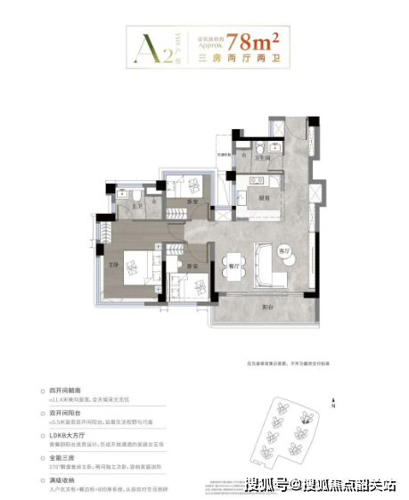 建面约78㎡三房两卫:实际使用面积高达90-95㎡,超越市场同类产品,非常适合首次置业者。