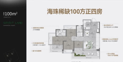 100㎡四房两厅两卫: 海珠区内少有的100平米内正四房户型,带有7.2米大阳台和独立主卧套。