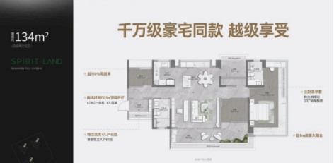 134㎡四房两厅两卫: 豪宅级别的配置,带有8米大阳台和独立衣帽间。
