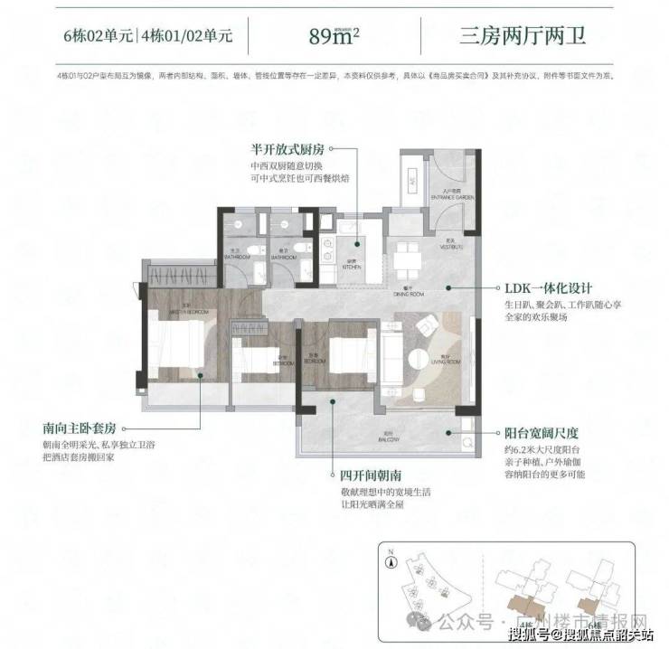 建面约 88-89 ㎡三房两厅两卫:约 6.2m 大尺度阳台、LDK 一体化设计、四开间朝南