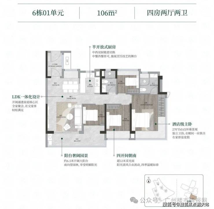建面约 106 ㎡四房两厅两卫:约 6.5m 开阔大阳台、超 12 米采光面、LDK 一体化设计、酒店级主卧