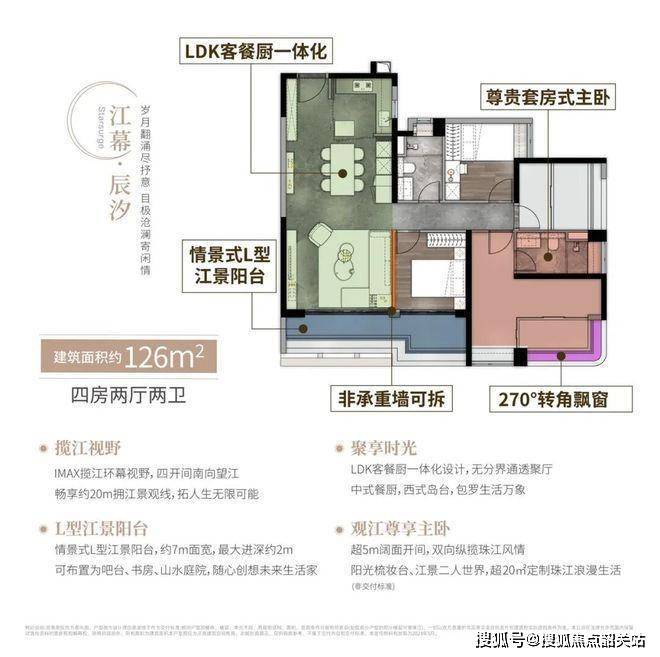 最顶级的还要数126㎡的四房,这绝对是改善型购房者的首选。5开间南向望江的设计,带来了约20米的超长拥江景观线,270°环幕视野让江景渗透到房间的每个角落,这种体验真的太震撼了。L形江景阳台面宽达到了约7米,进深约2米,空间非常宽敞,不管是打造一个小花园,还是作为休闲娱乐区,都完全没问题。客餐厨一体化的空间更是开阔,亲朋好友聚会都能轻松容纳。主卧是“观江超级主卧”,不仅有超5米的阔面开间,还定制了江景梳妆台,躺在床上就能欣赏到珠江的美景,双向纵揽珠江风情,仪式感拉满。这个户型不管是空间尺度还是景观资源,都达到了豪宅的水准。