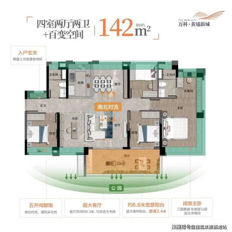 125㎡四房:主卧套房带衣帽间,南北双阳台,对流设计夏季降温5℃;