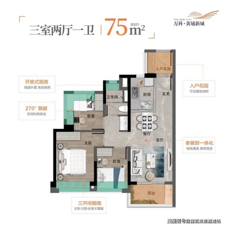 75㎡三房:LDK一体化设计,阳台进深1.8米,可改造为书房;