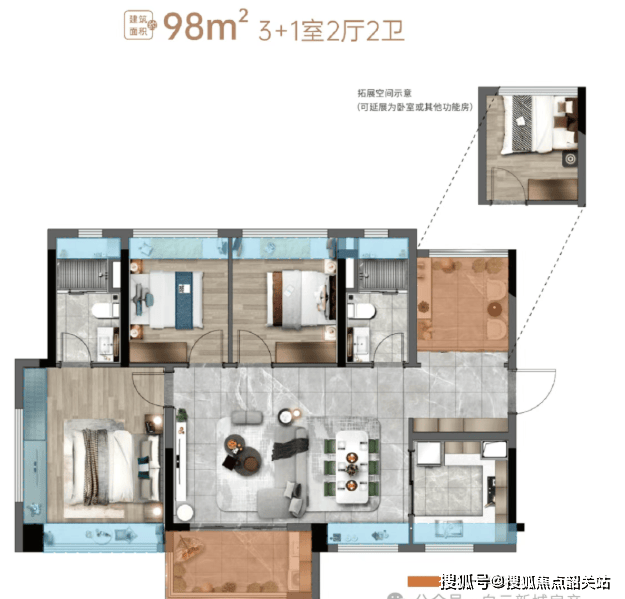 98㎡四房两卫:二胎家庭理想之选,功能分区清晰;