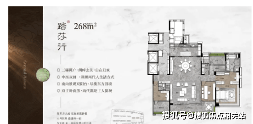 268㎡五房(楼王):3 梯 2 户板楼,18-20 层,配备保姆电梯 + 保姆房,业主与保姆动线分离,约 18 米南向面宽,LDKG 近 120㎡大方厅,双主套设计(均带独立卫浴 + 衣帽间),主卧 270° 全景飘窗(尺度超 9 米),一线观中式园林与山顶公园,实得面积超 280㎡,仅 25 个席位,清盘阶段稀缺性凸显,适合高净值人群。