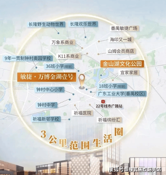 配套方面,项目教育资源丰富,自带 12 班幼儿园,东侧地块规划 36 班九年制学校(参考番禺政策大概率有直升优势),周边还有钟村奥园学校、省一级钟村中心小学与钟村中学,更紧邻广东工业大学番禺校区,高校资源能为办学赋能,提升教育起点。商业配套成熟,斜对面就是祈福缤纷汇,3 公里内有万达广场、天河城、四海城、山姆、宜家,即将开业的 K11 与规划中的万象系商业,进一步丰富高端消费选择。医疗与休闲资源也不逊色,周边医疗配套完善,项目北临约 1630 亩金山湖文化公园(直线距离约 400 米),社区内还打造约 1.3 万㎡中央园林(一轴两环五核心景观)、约 2700㎡高定会所(含恒温泳池、健身房、私宴厅、亲子乐园),甚至车库配置劳斯莱斯同款 “星空顶”,约 120 米弧形归家界面更显恢弘,全方位满足业主生活、休闲、社交需求。