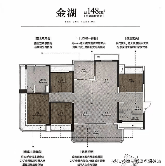 项目主打建面约 95-146㎡全南向低密湖居作品,均为高使用率的新规户型,设计亮点十足。98㎡四房两厅两卫(东南向)作为 CBD 稀缺湖居上车首选,拥有超 6 米阔尺阳台,270° 环幕视野,四开间朝南且南向大面宽超 12 米,采光通风极佳;116㎡四房两厅两卫(东南向)配备超 7 米大开间奢阔景观阳台,约 15.9 米采光面,南北通透,主卧套房搭配独立明卫与 270° 瞰景飘窗;120㎡四房两厅两卫(东南向)享百米楼距园景,约 7 米大尺度环幕景观阳台带来 270° 开阔视野,全景通厅设计让客餐厅一体通透,四开间朝南且采光面达 13.1 米;132㎡与 148㎡户型则更适合改善型家庭,分别拥有超 50㎡超感大方厅、约 30㎡奢华套房主卧,以及超 16 米超大尺度观景面、6.6 米超大横厅等设计,全方位提升居住舒适度与品质感。
