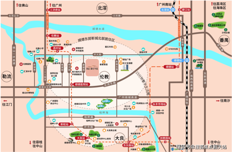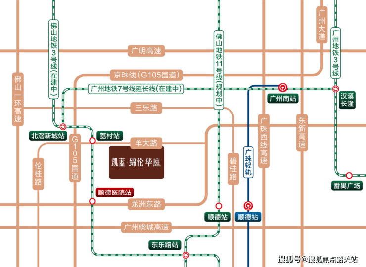 凯蓝锦伦华庭的区位优势突出,地处顺德伦教核心区,距离佛山地铁3号线顺德人民医院站约400米,是真正的地铁口物业。佛山地铁3号线已通车,未来可无缝对接广州地铁7号线,实现广佛快速一体化通勤,11站直达广州南站,通勤效率极高。此外,项目还靠近广珠城轨顺德站,约8分钟可达,乘坐城轨15分钟直达广州南,约1小时到珠海,真正实现广佛中江珠多城互联。道路交通方面,二横六纵路网全面覆盖,包含龙洲路、广州绕城高速、105国道、碧桂路等主干道,2分钟上高速,10分钟可抵达北滘,25分钟车程到番禺市桥,大幅提升出行灵活度。交通的立体化布局,让业主无论是工作、出差还是休闲娱乐,都能高效切换,彰显顺德东部新城交通枢纽的价值。