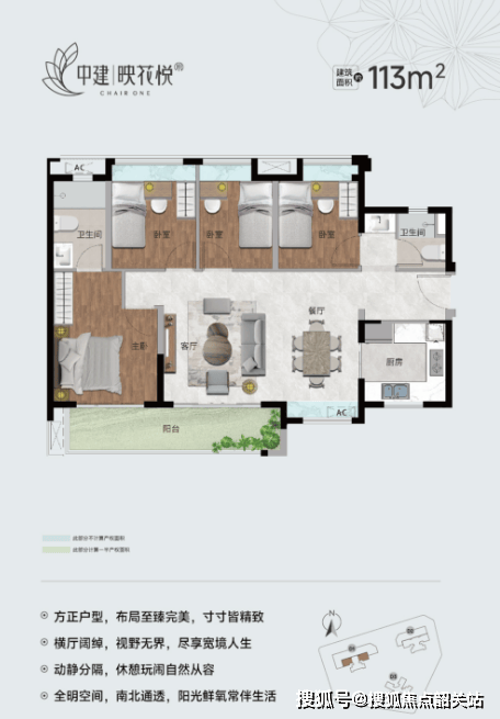 113㎡四房两厅两卫:IMAX全景奢阔户型,横厅设计,动静分隔,全明空间,南北通透。