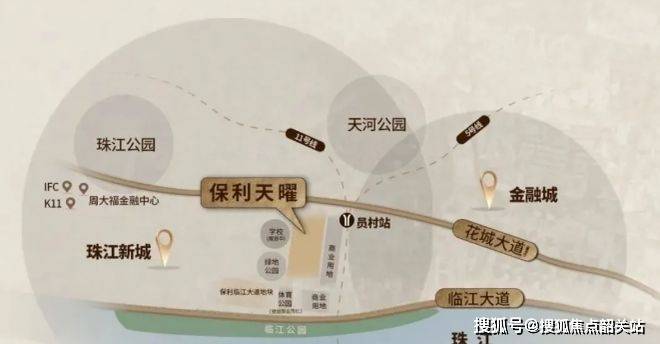 商业配套成熟完善。3KM 内有 K11、天德广场、天汇广场、广粤天地等国际商业汇集,未来还能共享保利面粉厂项目及珠城马场改造项目配套。一站之隔有科韵路金融城广场,距离三溪美林天地、山姆、宜家也很近,自驾、地铁均可到达。5KM 内有广州图书馆、广东省博物馆、广州大剧院组成广州人文客厅。医疗资源丰富,周边有中山大学附属第六医院(金融城院区)、华侨医院等多家医院。休闲方面,步行可达临江带状公园、市政口袋公园(规划中),南面是滨江绿带公园,西侧是绿地公园(建设中),还有精心打造的园林通廊和下沉庭院等,生活惬意舒适。