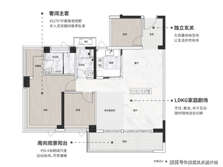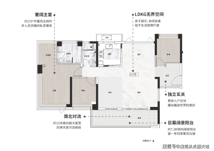 餐客厅一体化设计,连通约7.2米南向阔景阳台,亲友聚会无压力;主卧带步入式衣帽间,私密性更佳。