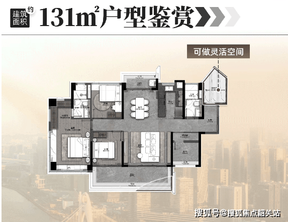 珑璟台建面约 123㎡户型创新性打造 4 + 1 房,四开间朝南,双面宽景观阳台约 6.5 米,还有灵活的 “魔方空间”,可将厅卧合并成约 62㎡LDKG 大方厅。约 131㎡户型入户设拐角玄关,南北对流双阳台,南向阳台约 7.5 米,主套配备 L 型衣帽间与环幕大飘窗,充分满足刚改和改善型购房者对空间与景观的需求。
